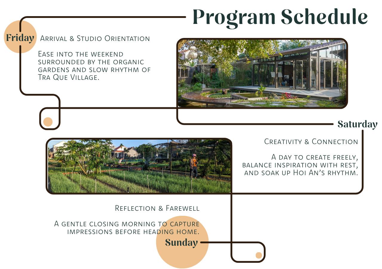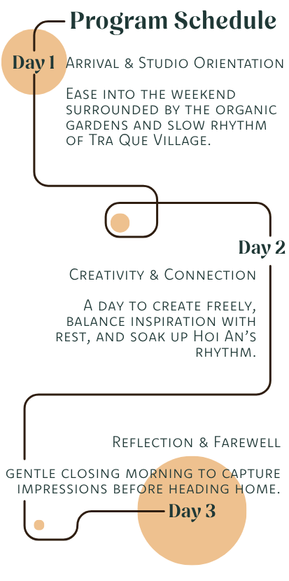 Every activity is optional, and the studio is always open to work on your projects or try out different media and materials. Whether painting, exploring Hoi An, or simply unwinding by the pool or the beach, this weekend offers the perfect blend of creativity, culture, and calm.